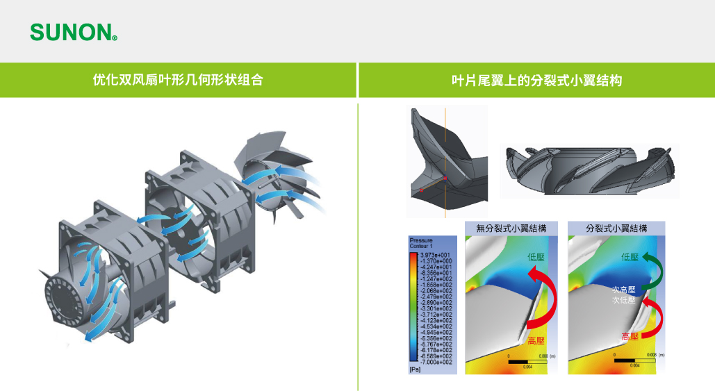 建準AI風扇系列為超高轉速雙風扇,透過扇葉與流場優化設計,提供更大風量的散熱選擇,風扇效率提升50 %以上,優化設計結合七葉進風扇、五葉出風扇與靜葉成一體,以提高流場的順暢度,達到分流與降低風切的影響;另可客制化設計在葉片尾翼上增加分裂式小翼結構減少渦流產生,大幅降低阻力,達到更佳的風量與風壓,能在第一時間把芯片的熱移走,減少熱量累積,如此芯片維持運作于90度以下的最適操作溫度。